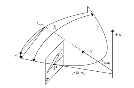 • The blade centerline was defined as a quadratic curve, spanning a defined angle (χ) between its end points on the rim.