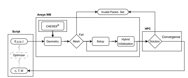 CAESES generates geometry variations using design parameters like blade count, centerline angle, stagger angle, and advance ratio. These variations are then transferred to Ansys Workbench via the API, allowing for automated meshing, simulation setup, and hybrid initialization. The simulation is run on an HPC, evaluating thrust, torque, and efficiency. The results are then transferred to the optimizer, which refines the design. If a set of design parameters leads to a null solution, it is flagged as invalid. This automated pipeline reduces manual workload, accelerates design exploration, and ensures only feasible, high-performing designs are selected.