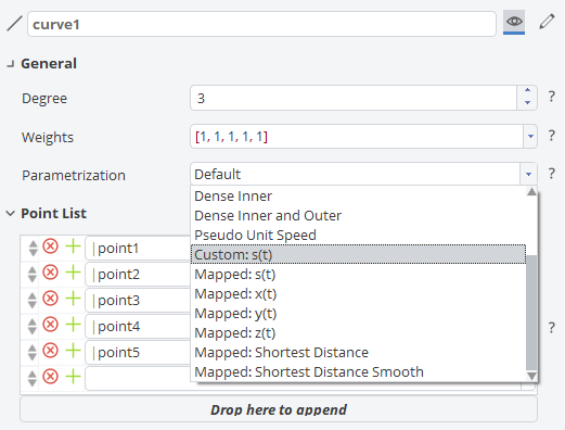 Several new curve parameterization options have been added in CAESES 5.4, giving users more flexible control over the speed of the curve parameter t∈[0,1] along a curve. These options make it possible to:
