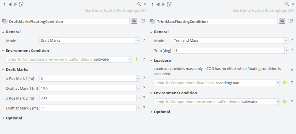 Hydrostatic analyses in CAESES 5.4 have been extended with additional options for defining floating conditions. Users can now specify floating conditions based on: